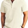 - Classic Fit —- This men’s short sleeve henley shirt features a henley collar design, short sleeves, vertical hem, slight vertical ribbed design. Special stright stripes design can make you look so fashion in crowded.